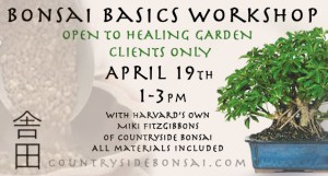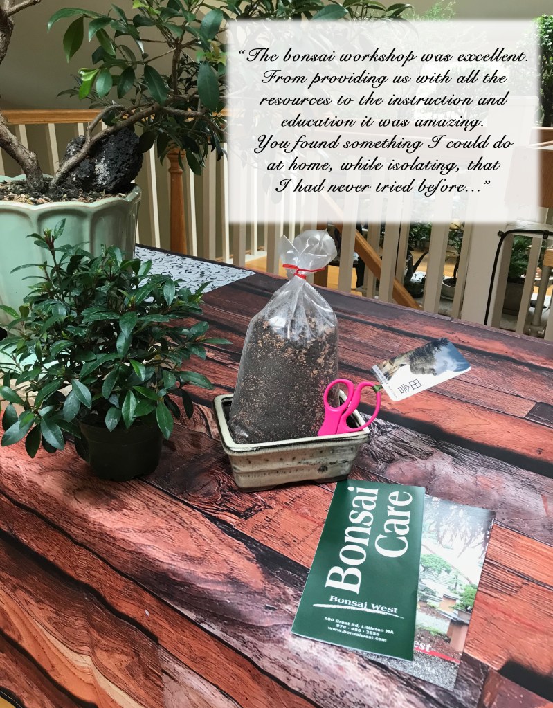 “The bonsai workshop was excellent. From providing us with all the resources to the instruction and education it was amazing. You found something I could do at home, while isolating, that I had never tried before. The healing gardens efforts to provide us with wonderful opportunities while this pandemic continues is beyond helpful. I appreciate all of you for brainstorming. I am so glad to have found this amazing space.”… September 30th 2020 review of Workshop for the Healing Garden, Harvard, Ma